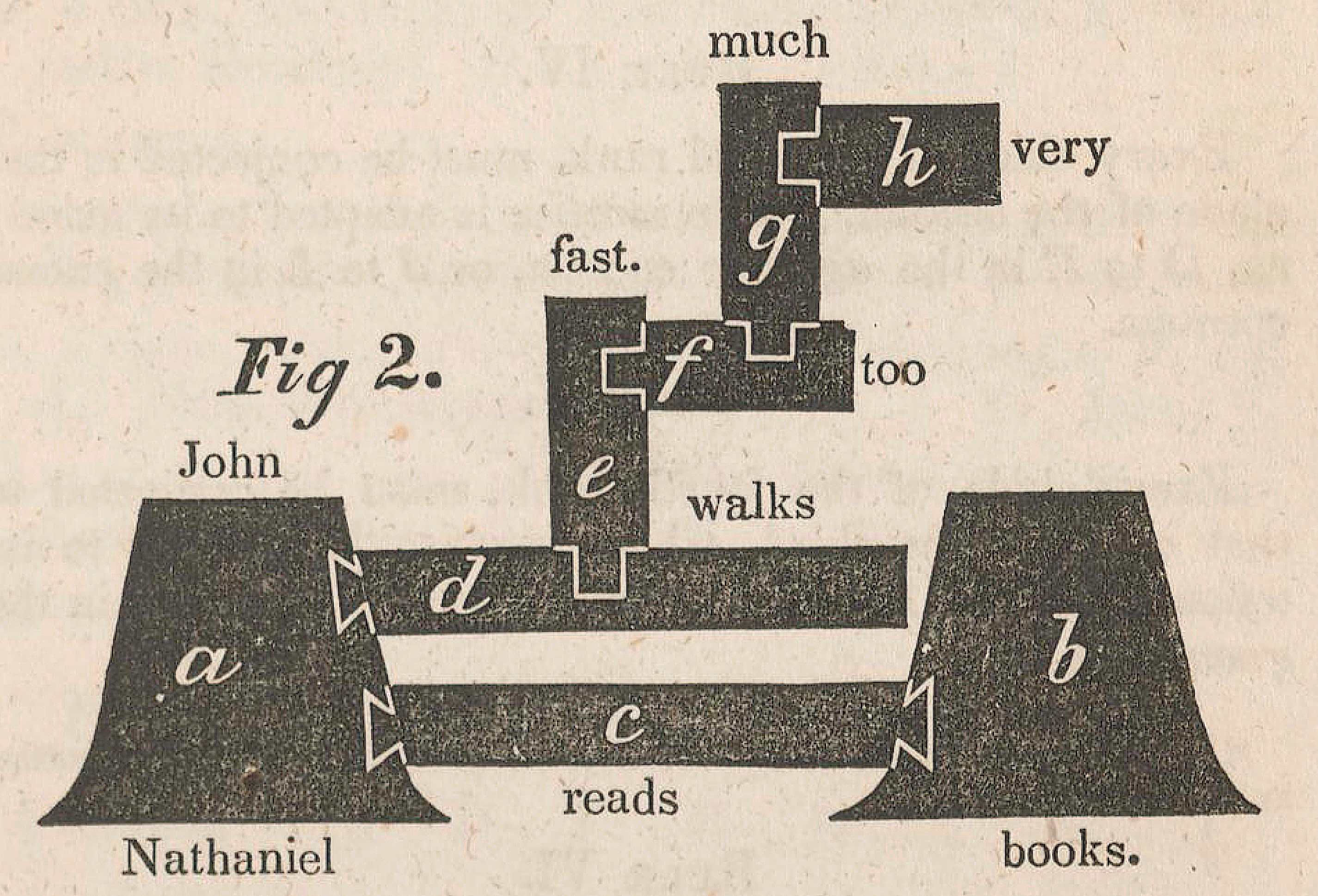 In the study of grammar the blackboard may be used to exhibit the inflections of the various parts of speech; it may also be used in syntax, to point out the connection of the principal words to each other. The method of doing this is by writing on the board the sentence to be parsed, and then connecting by curved lines those words that have any grammatical connection with each other. The instructor at the same time pointing out what that relation is. (James Ray 1830, cited in Lyman 1922: 148, emphasis added)