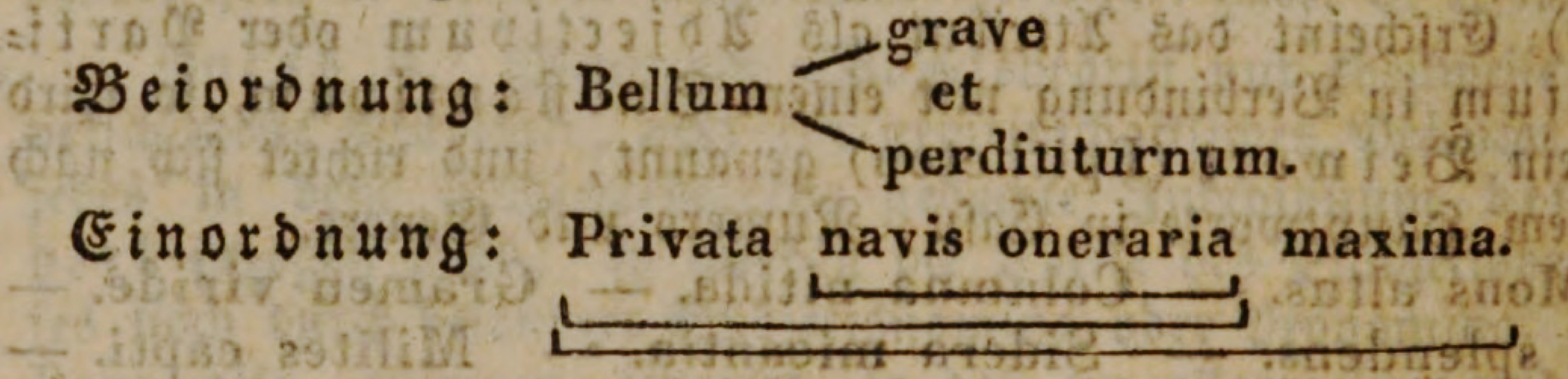 Eine vorzüglich Uebung ist hier die Zergliederung verwickelter Perioden, wovon hier noch zum Schluß ein Beispiel stehen möge. (Grotefend 1825: 298)
